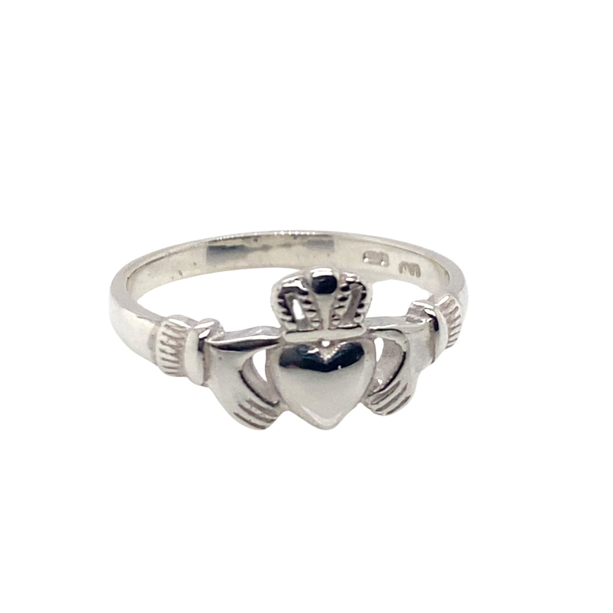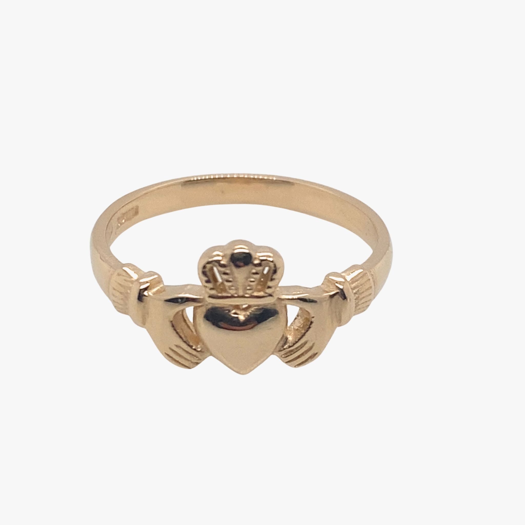 This Ladies Claddagh ring was created by John and forms the symbols of Love , Friendship and Loyalty. Heart = Love , Hands = Friendship  ,  Crown = Loyalty . The shoulders of this ring is a plain band.