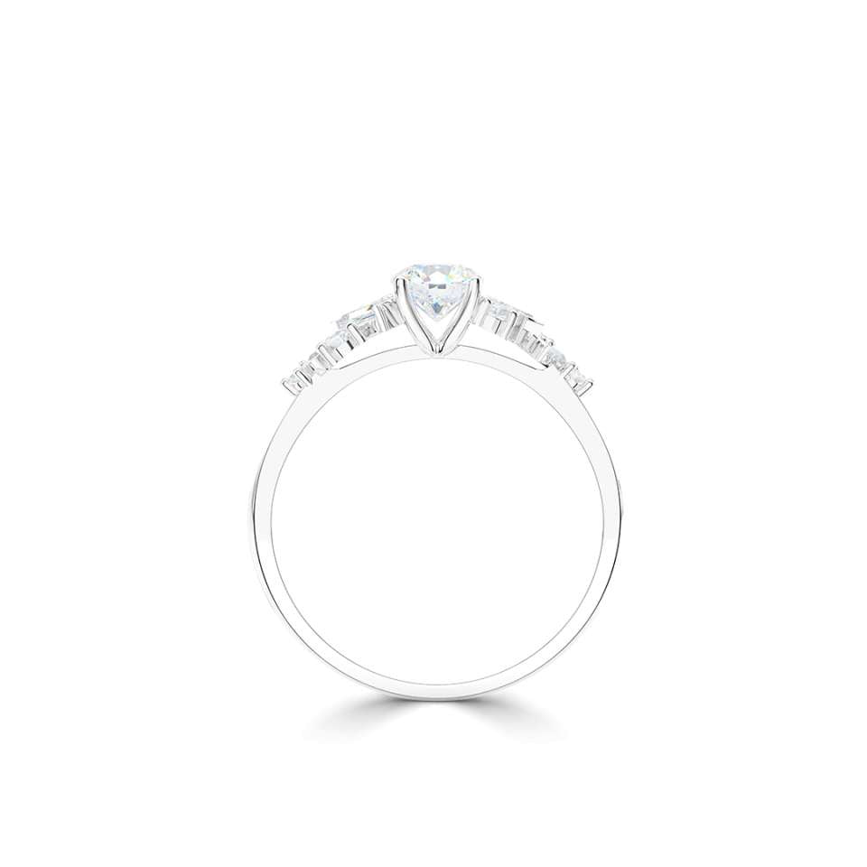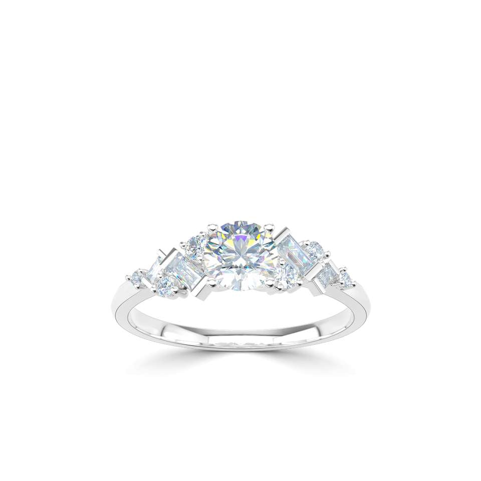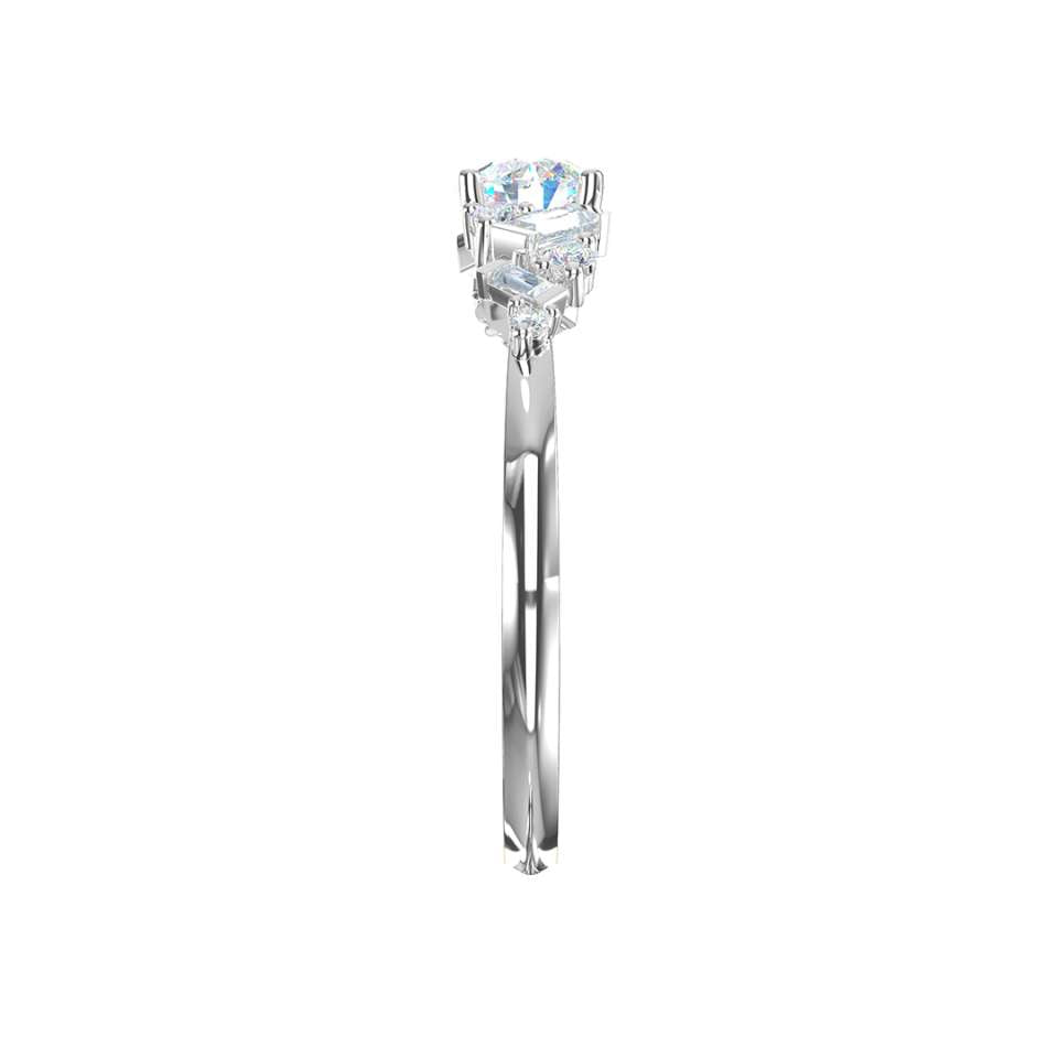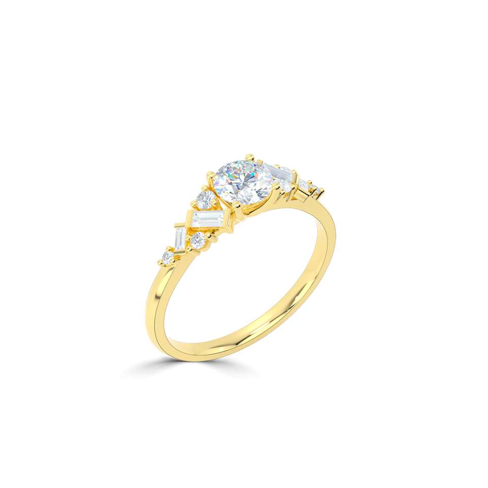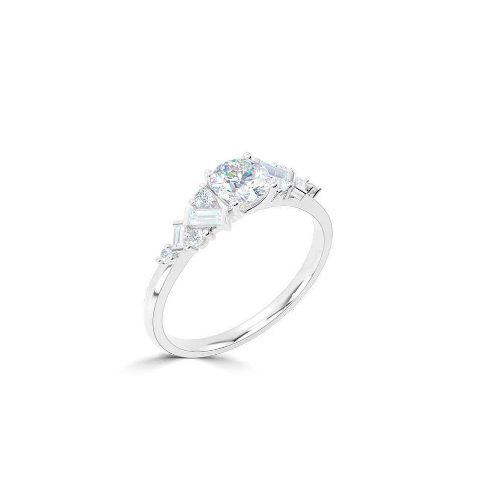 An art deco inspired four claw round solitaire with baguette and round diamond set shoulders.