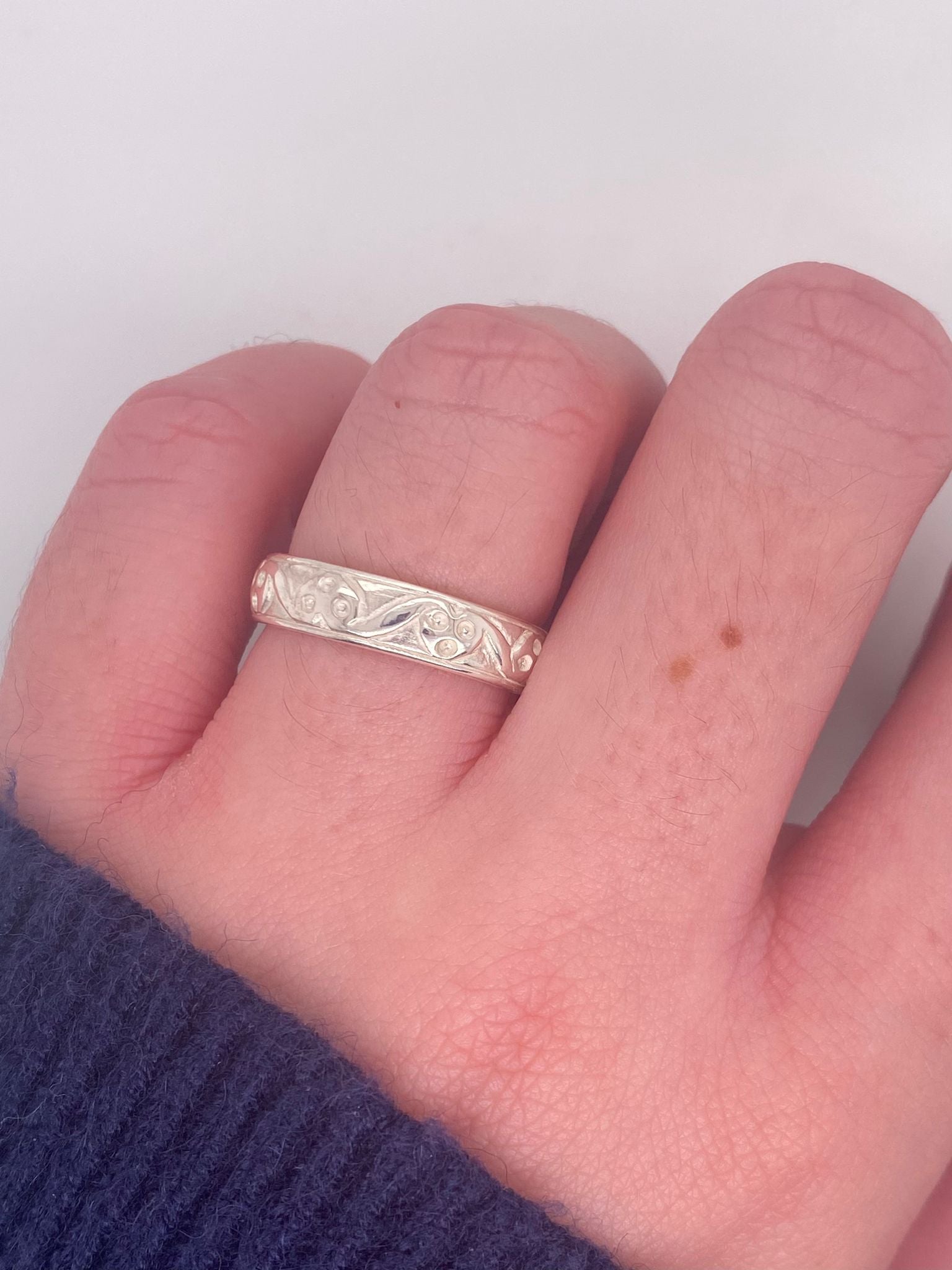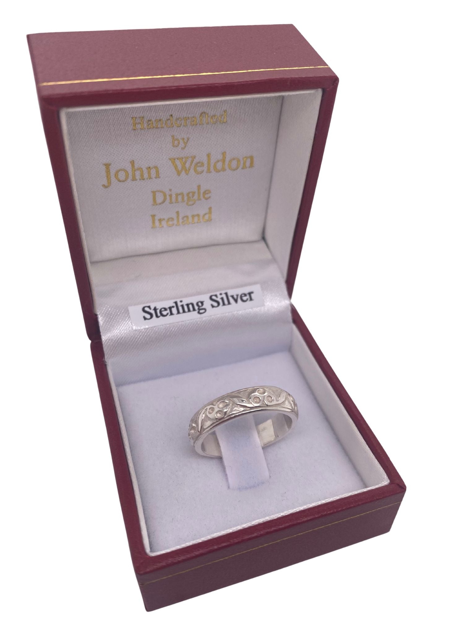 My husband and I bought matching bands while visiting Dingle. Mr Weldon was very kind and very helpful and all his jewelry is beautiful but this style really caught our eye. I liked the Durnburg ring in the store, but the more I have worn it the more I have grown to love it. It's solid, attractive, interesting, and has become my favorite piece of jewelry to wear.