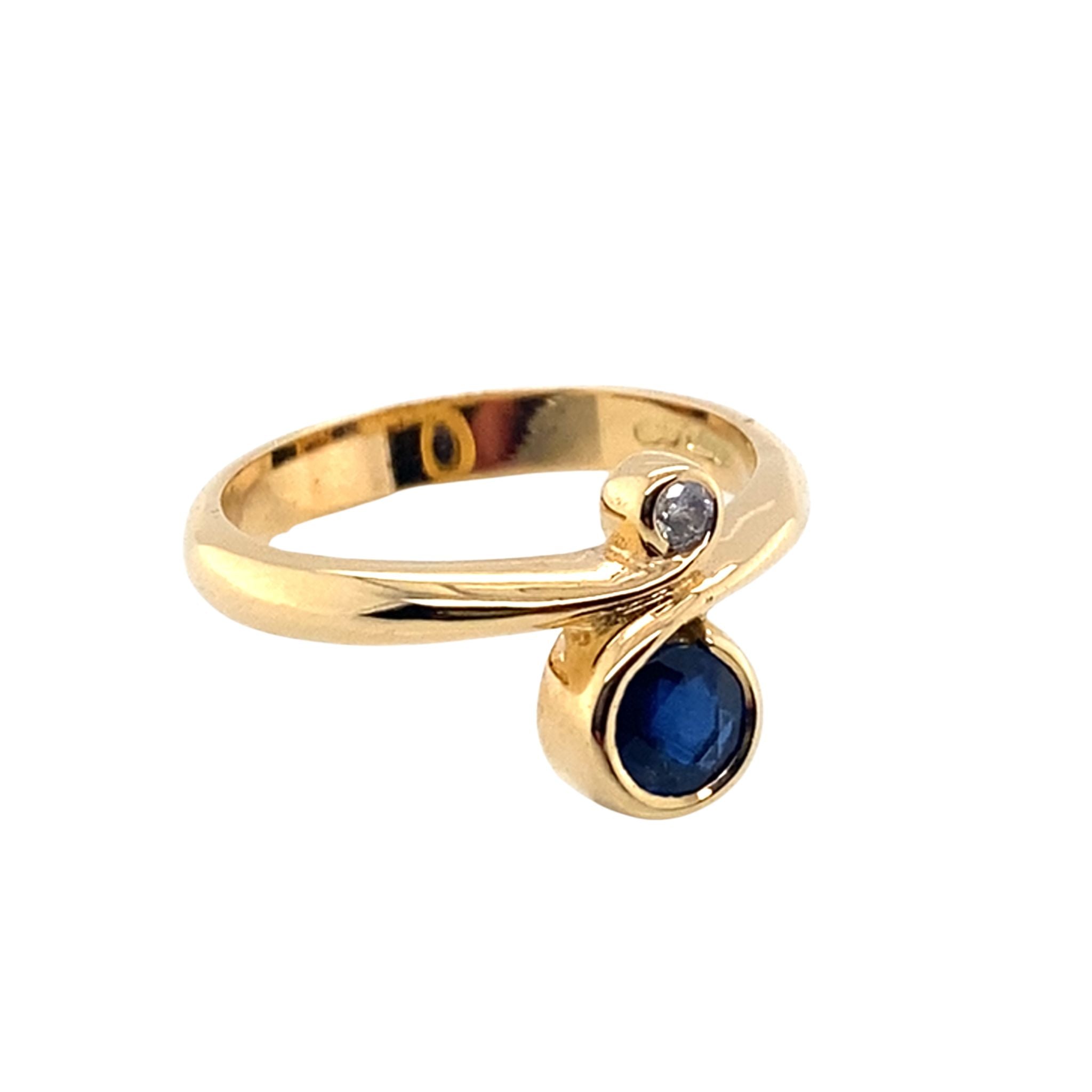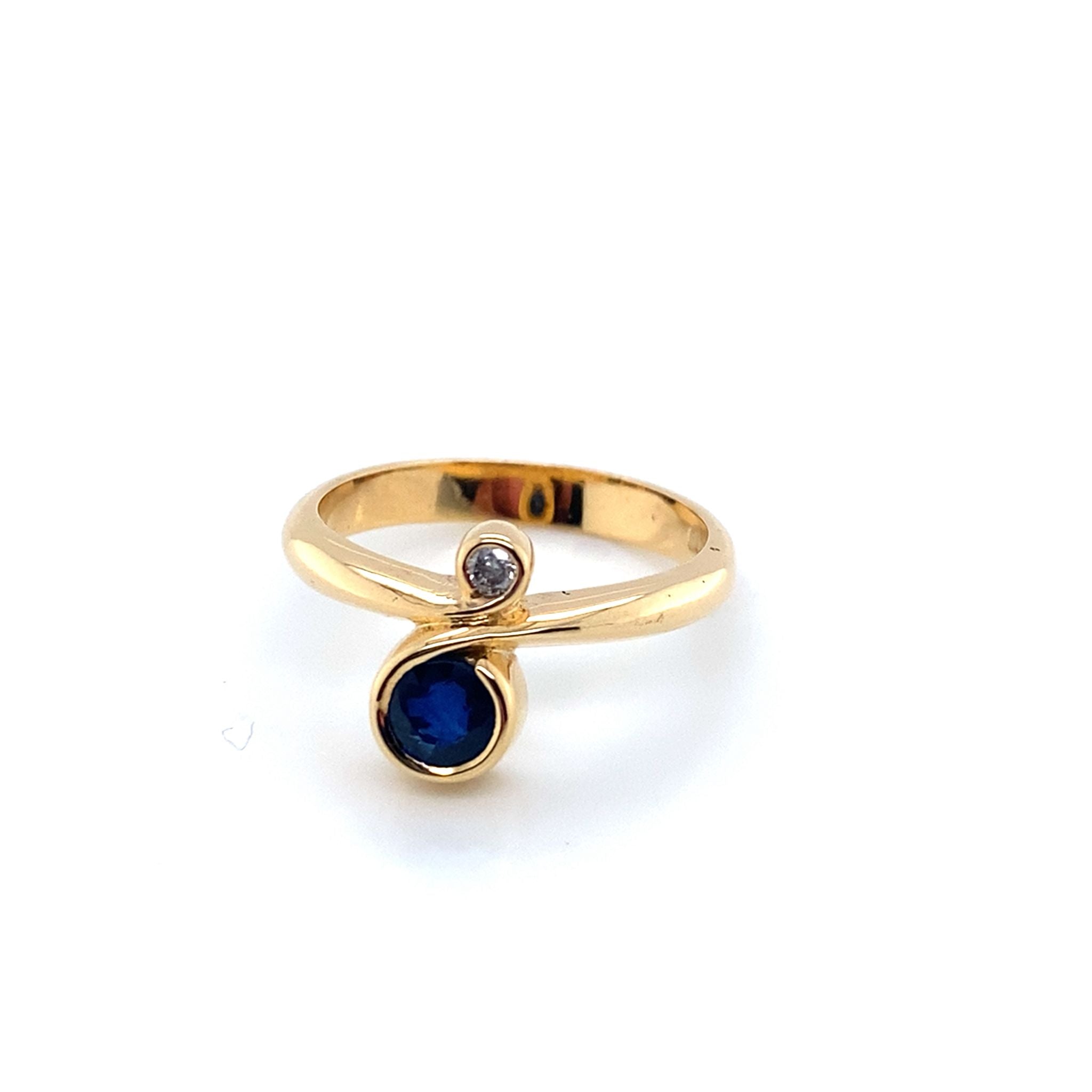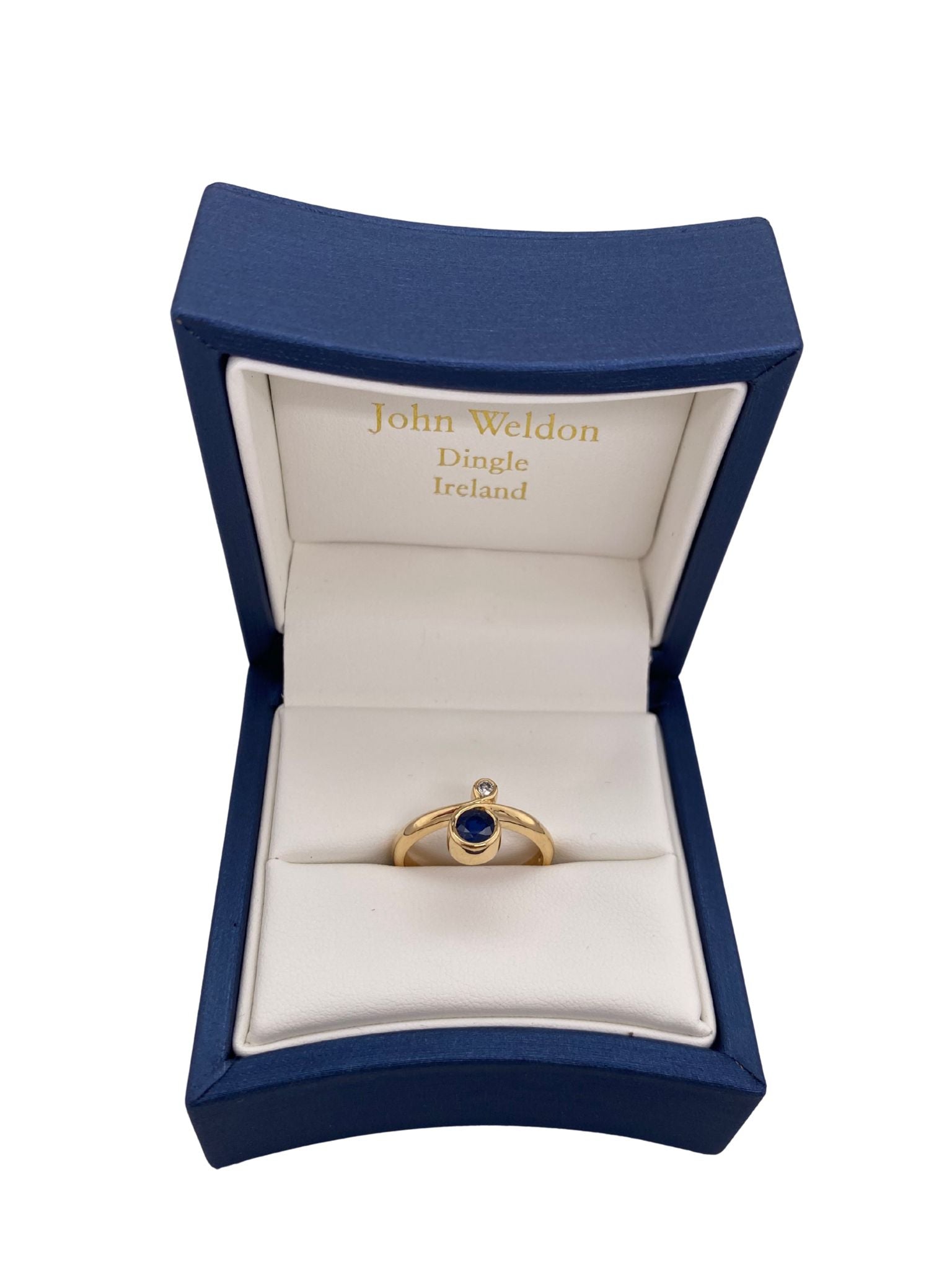 This beautiful bezel set ring has been handcrafted by John Weldon using the fine arts of our ancient ancestors the Celts. The flowing curves on either side create a spiral effect symbolizing the cycle of life. The main stone  is 5mm in diameter weighing approximately 0.50ct.and is available in Sapphire , Emerald or Ruby. The small stone is a round brilliant cut diamond 2.0mm in diameter and weighs approximately 0.03ct.